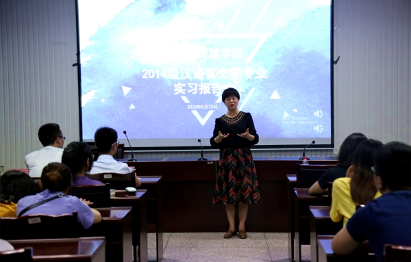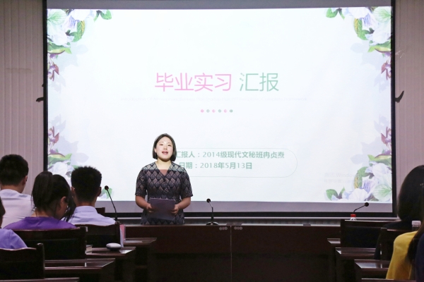 5月13日晚18:50,文化与传媒学院2014级汉语言文学专业实习报告会在知津楼B523召开。会议由2015级汉语言文学专业员工张爱芳主持,2014级文秘专业实习员工张嘉益、周泽玉、周晓英、杨琳、冉贞焘进行实习报告。文化与传媒学院副经理、文秘系系主任李芹燕,公司党政办办公室主任、文秘系教研室主任周杰,文秘系专业教师、2015级文秘专业辅导员余建荣以及2015级文秘专业员工参加了本次会议。