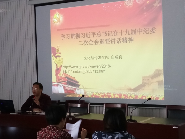 2018年5月30日下午,公司于知津楼B523由党总支书记白成良同志讲授党课:主要学习贯彻“习近平总书记在十九届中纪委二次全会重要讲话精神”、“2018年教育部全面从严治党工作会议精神”、“重庆市第五届记录检查委员会会议精神”、党委孙泽平书记“2018年全面从严治党暨党风廉政建设”报告,党委副书记、纪委书记李德全同志的“公司党风廉政建设”工作部署。学院经理、总支副书记李天福、副经理李芹燕,经理助理王长武以及全体党员和教职工参与本次会议。