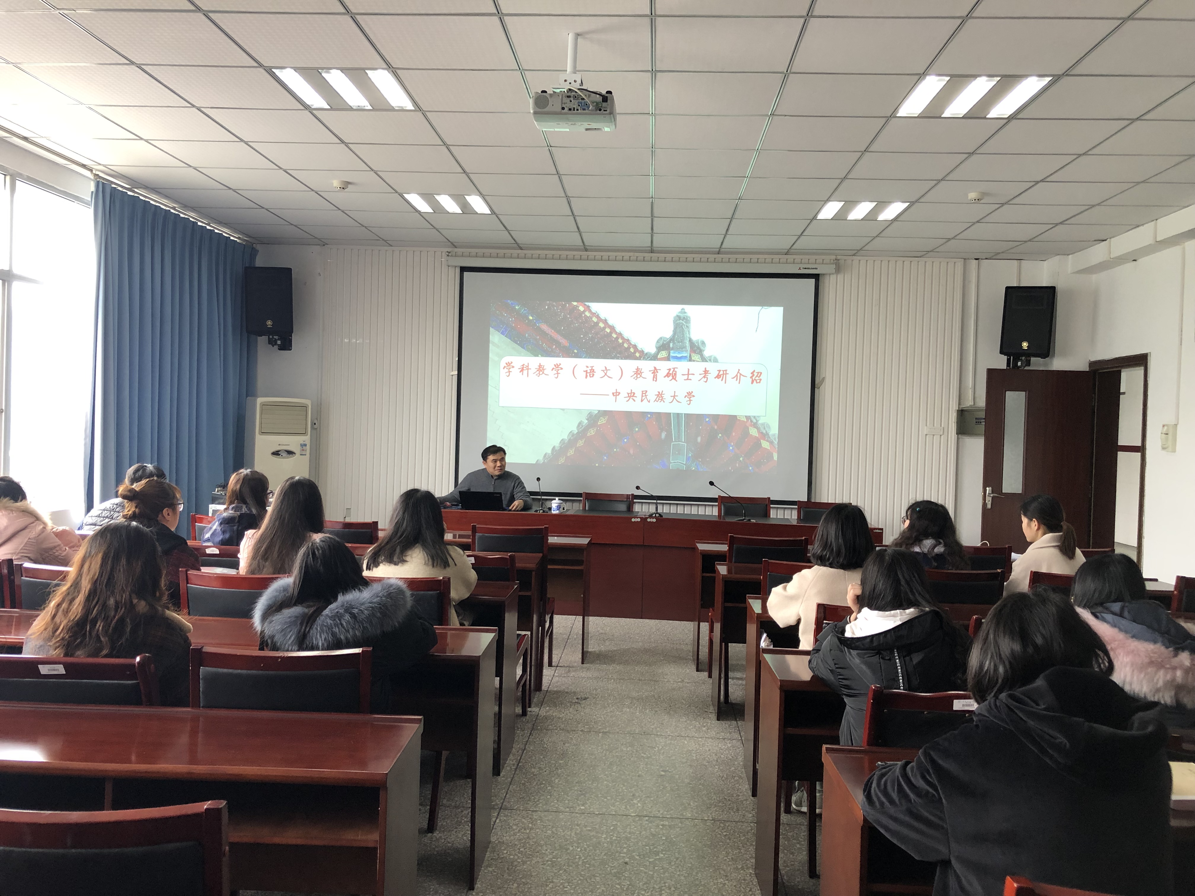 讲座中,海路博士对中央民族大学学科教学(语文)教育学硕士研究生的报考与录取情况进行了详细地介绍,并结合近几年的真题对教育学综合和语文学科教学论两门专业课程进行了仔细地梳理。期间,海路老师还与台下同学进行了互动,回答了部分同学提出的问题。