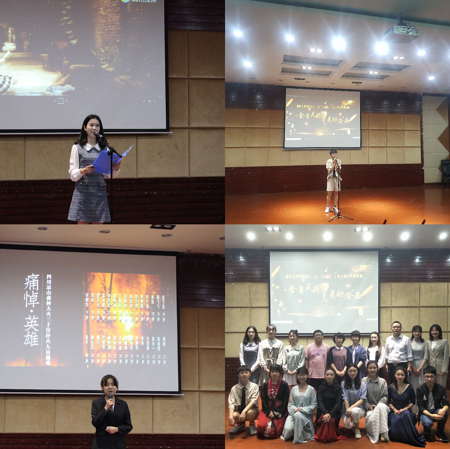 经过初赛、复赛的层层选拔,来自全校的二十位选手一路上披荆斩棘,终于站在了今天决赛的舞台上。比赛分为个性主持、才艺展示、即兴评述三个环节。才艺展示环节,易芳用一首《唱脸谱》勾起大家对京剧的记忆,娓娓道来京剧脸谱的起源;刘璐在为《神偷奶爸》配音过程中,凭借流利的英语和饱满的感情获得评委观众的一致好评;王虹懿的古筝独奏《新十面埋伏》的节奏整齐紧凑,极像古代行军时笙歌齐鸣的壮丽场面。在个性主持环节中,更是高潮迭起。谭寅卓以当下正热的电影《比悲伤更悲伤的故事》为题材,在《光影星播客》中为大家展示了别具一格的主持风格;康译文主持的儿童类节目《快乐大巴》,为现场增添了活跃的气氛;刘怡丹在《品读人物》中为大家讲述了周恩来与邓颖超的爱情故事;张荣秀在《走进民俗》中细说了土家族的哭嫁习俗,并展示了土家族的摆手舞。最后,王虹懿、刘璐、刘怡丹以前三名的好成绩进入到即兴评述环节,面对评委的提问,选手们反应迅速,展现了他们出色的临场发挥能力。本场比赛精彩纷呈,选手们都表现的非常出色,整个馆内散发着语言魅力,飞扬着自信风采,洋溢着青春活力。