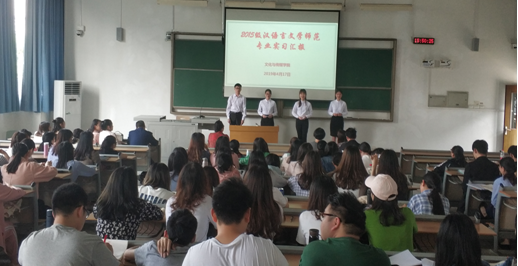 2019417日下午,2015级汉文师范专业实习汇报暨2016级汉文师范专业试讲领航课在知津楼7阶隆重举行。文化与传媒学院副经理李芹燕、中文系主任黄贤忠、语文教育教研室主任李东平等15名试讲指导教师、42015级优秀员工代表以及2016级汉文师范全体员工参加了本次汇报。