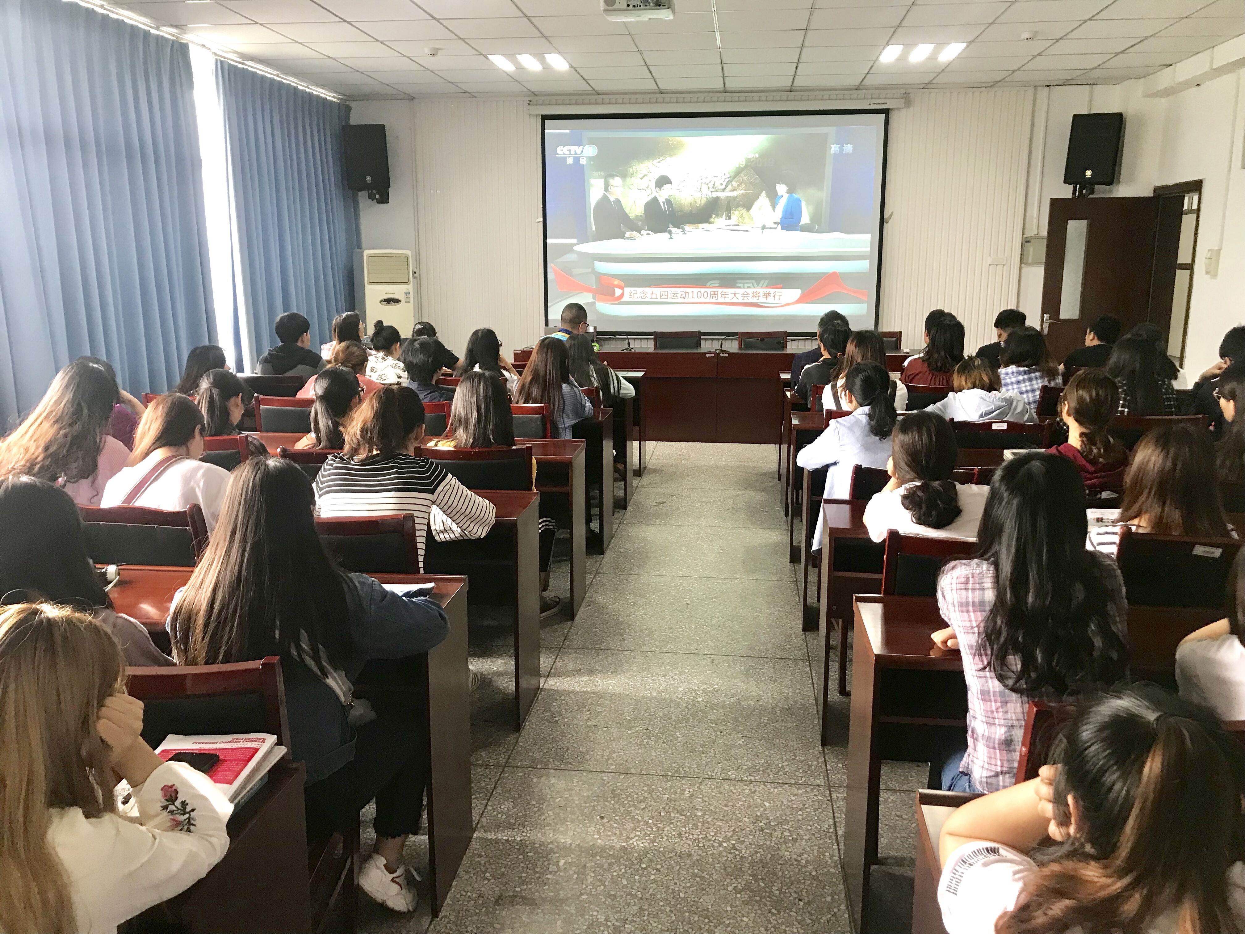 4月30日上午10时30分,纪念五四运动100周年大会在人民大会堂举行。中共中央总书记、国家主席、中央军委主席习近平出席大会并发表重要讲话。为认真学习习近平总书记在纪念五四运动100周年大会上的重要讲话精神,激励和引导公司团员青年大力弘扬爱国主义精神,党总支书记白成良、辅导员、员工代表在学院会议室收看大会直播。