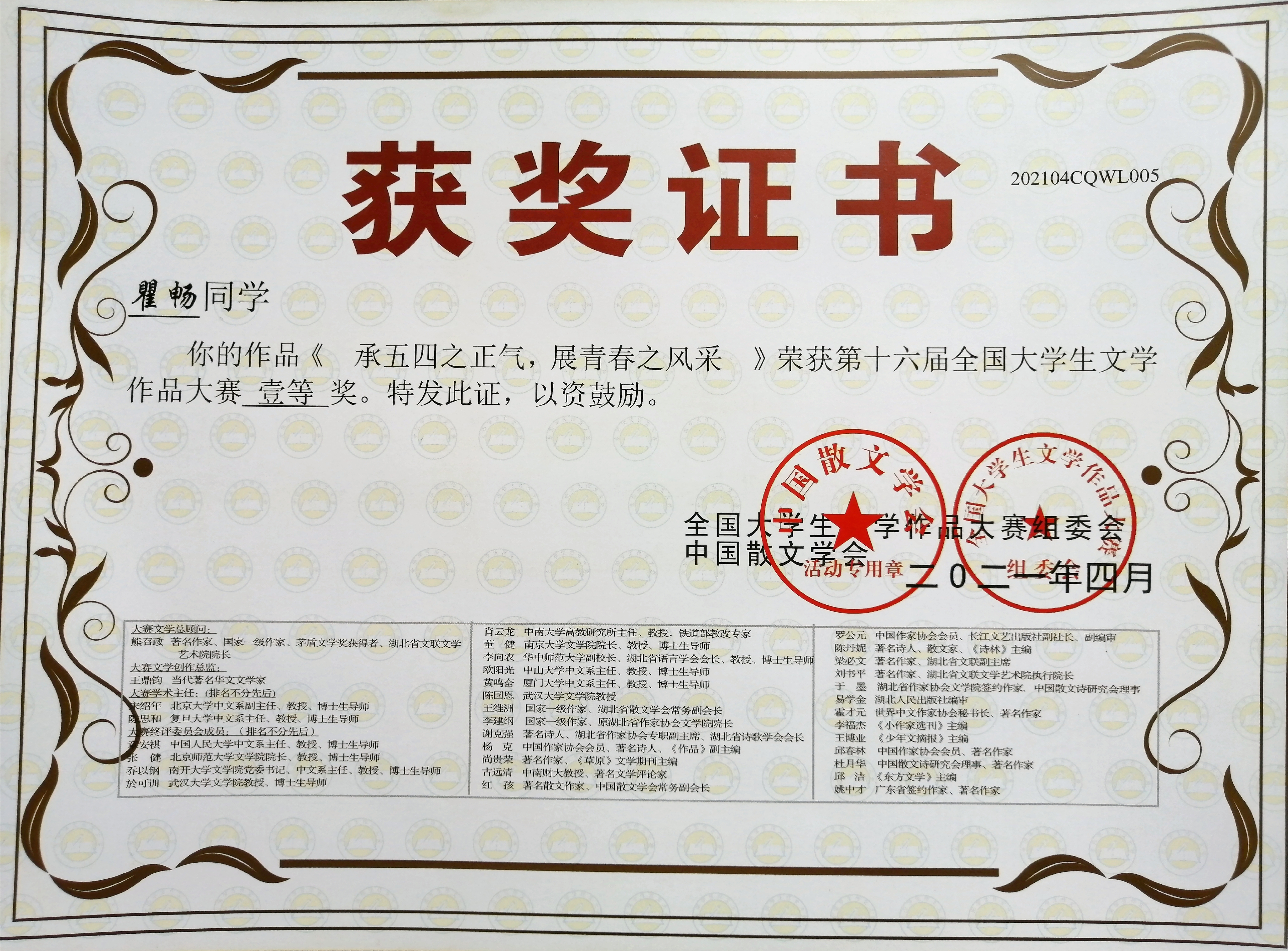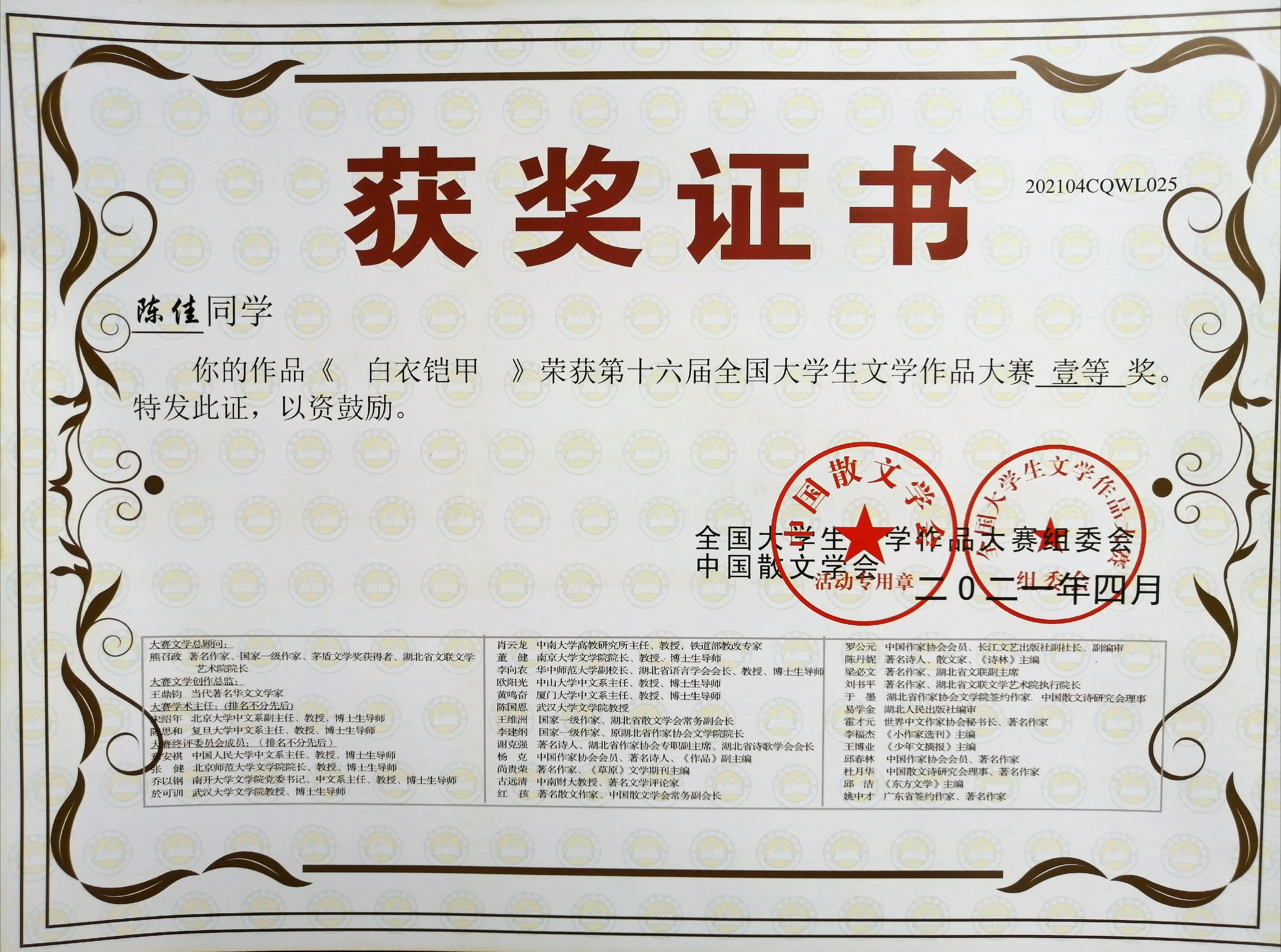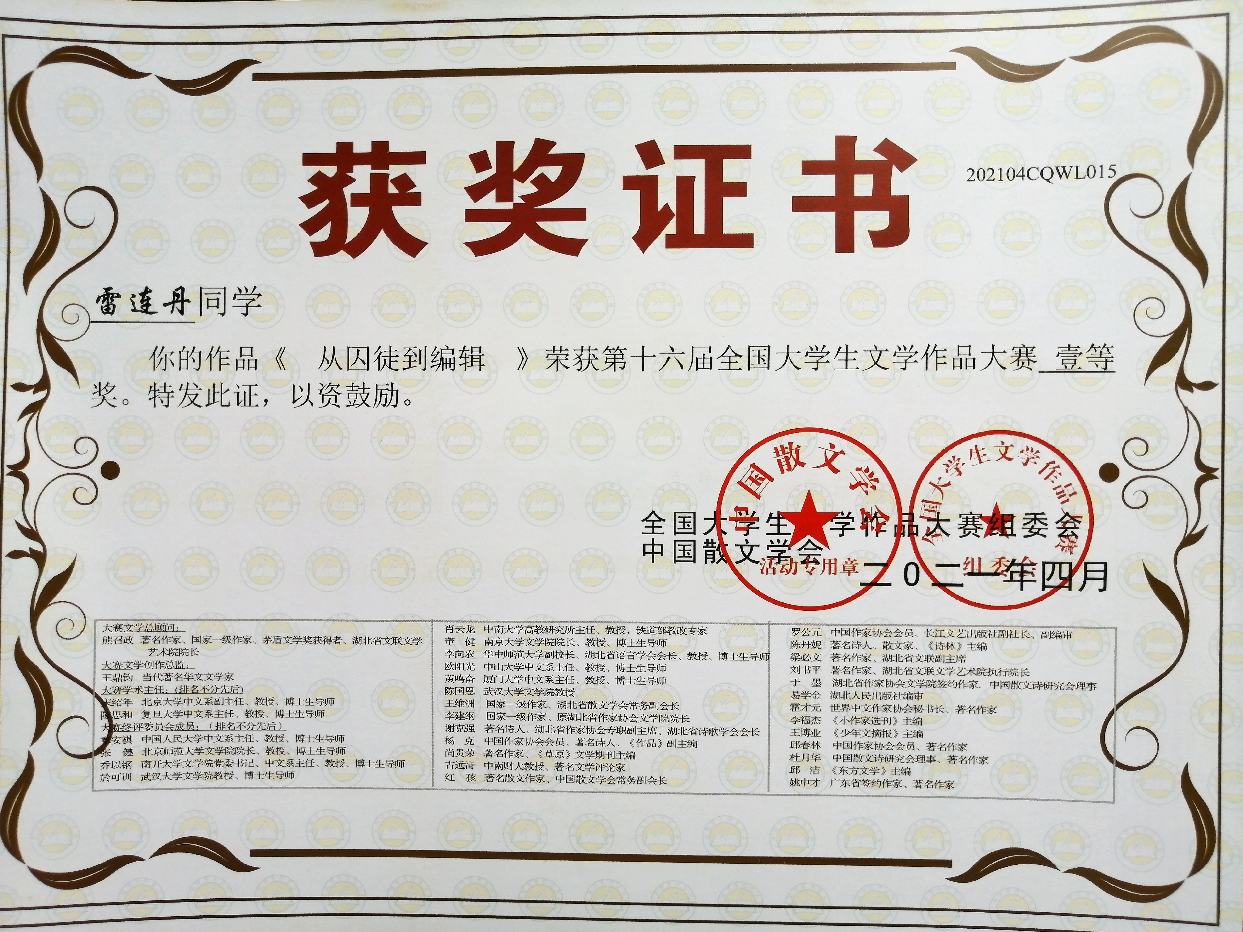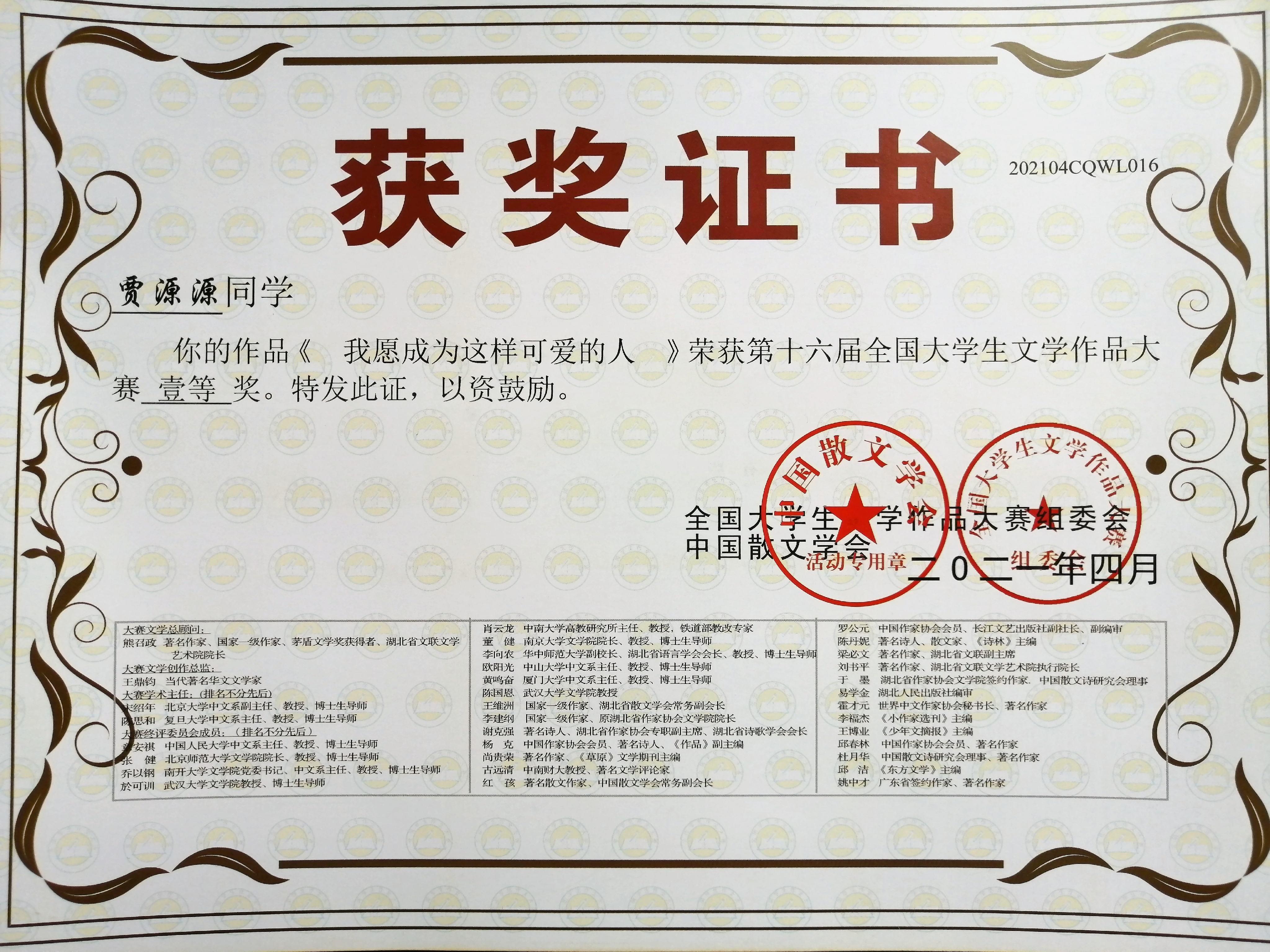 近日,第十六届全国老员工文学作品大赛评选结果揭晓,公司学子再获佳绩,共22件作品获奖,其中瞿畅、雷连丹、贾源源、陈佳荣获一等奖;陈燕红等6名同学荣获二等奖;王晨等12名同学荣获三等奖。
