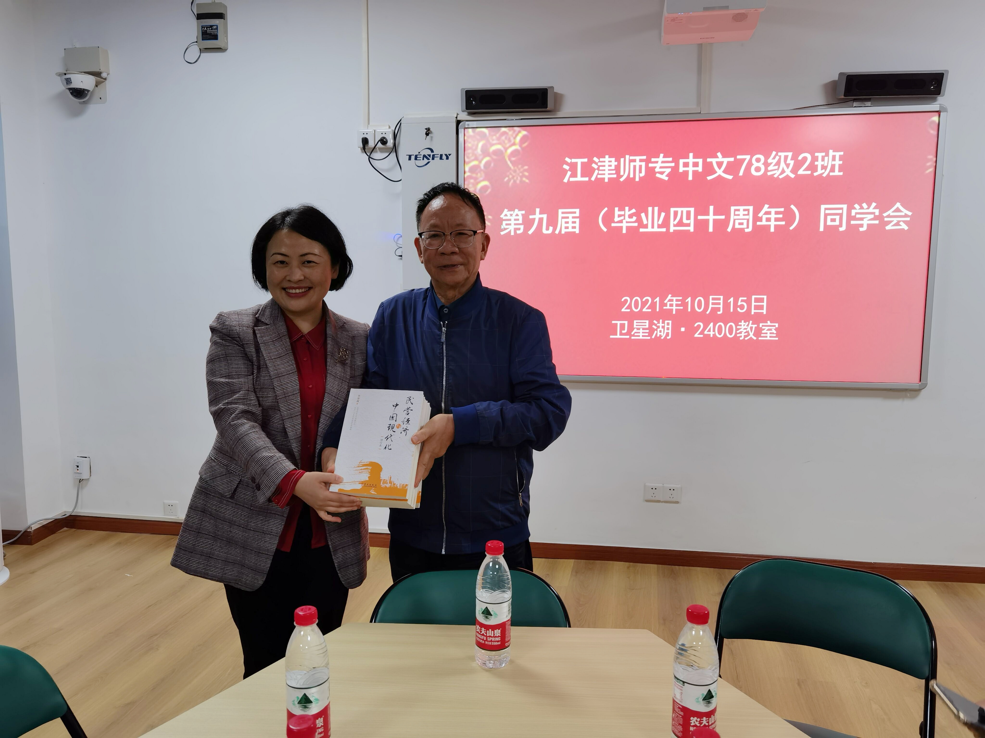 10月15日晚上,中文78级2班37名员工相聚母校卫星湖校区2400教室举行毕业四十周年座谈会,重温青春岁月,再叙同学情谊。文化与传媒学院经理、员工会会长李芹燕,党总支副书记、员工会副会长邱飞,以及中文78级2班员工参加座谈。原校图书馆支部书记蒋永平员工主持会议。