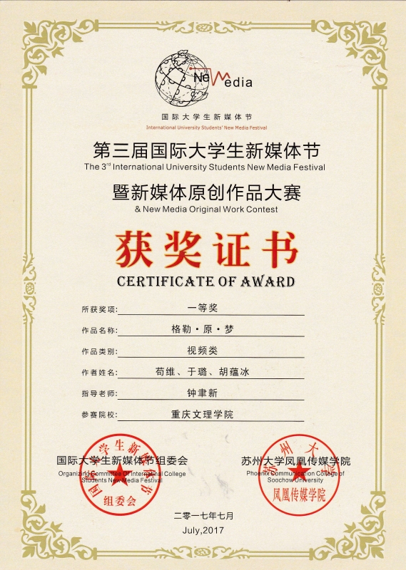 6 | 纪录片《格勒·原·梦》 | 第三届万峰林 国际微电影盛典 | 2017 | 一等奖 | 中国影视艺术协会/中国高等教育影视学会 |