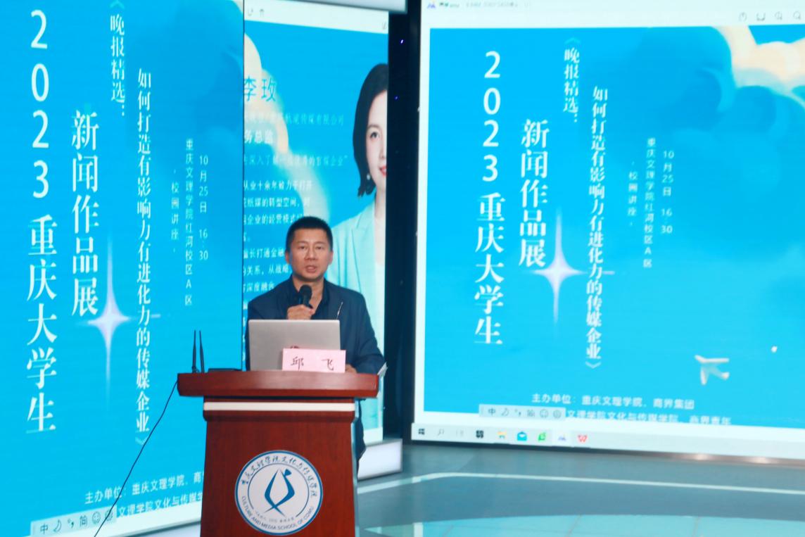 邱飞首先致欢迎词,然后介绍了李玫的重要业绩及经历,讲述了本次讲座的背景意义,引导传媒学子要跳出传统的专业思维,从经济等新角度去认识传媒行业。强调,从经济方面和创新创意方面来理解传媒是一个新颖的角度,发展创新思维、创新能力,这也顺应了时代和行业的发展。同时,员工应从多角度认识世界,从多角度挖掘自己的潜能,找准自己的定位。他表示,由公司和商界集团共同开展的重庆老员工新闻作品展大赛获得了重庆多所高校的大力支持,各校员工参赛活跃度高。希望能通过与商界集团联合举办重庆老员工新闻作品展评选活动提高同学们对主流媒体的认知,培养同学们新闻采写等多方面的能力。